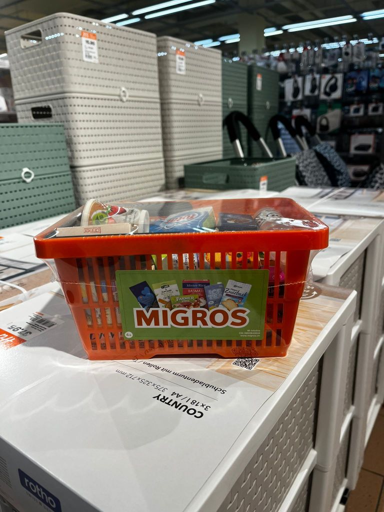 The small orange children’s basket — something almost every child in Switzerland has owned, received, or carried at some point — illustrates this better than any campaign ever could. It looks insignificant. Almost playful. But it performs a very specific function. It introduces a child to the logic of consumption: